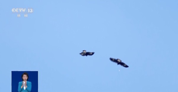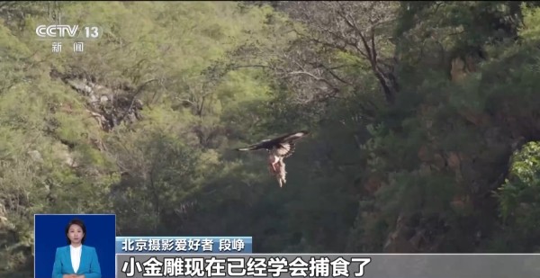 北京摄影爱好者 段峥:大金雕做一个示范,抓一个树枝,在空中扔下,然后一个俯冲,再把它捞回来,这样是锻炼它的飞行技能,小金雕实际上在旁边进行学习。