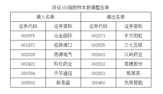 深证100调入山金国际、招商港口、思源电气等公司,调出东方雨虹、三七互娱、以岭药业等公司。